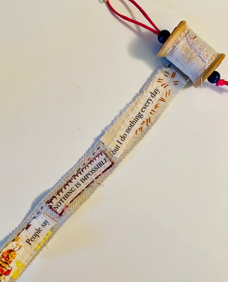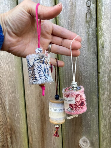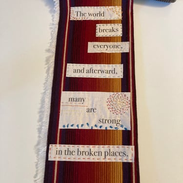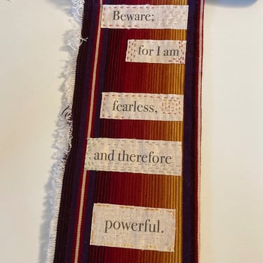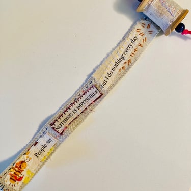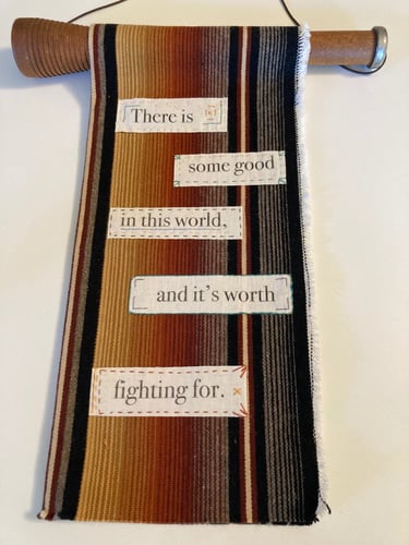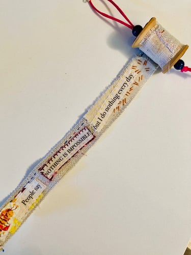 These fabric scrolls use old thread spools and fabric scraps. The larger hanging scrolls use industrial wool loom bobbins that I bought at the local mill. The inspirational quotes are printed with a home printer directly onto cotton muslin and are stitched with very simple variations on the running stitch. I worked on them in the mornings while everyone was waking up, or at night while we were all winding down. The process reminds me of journaling, but with stitches instead of pen. You just make marks. And most importantly, you fight the urge to start over or take out stitches. It's the mistakes that make them real.